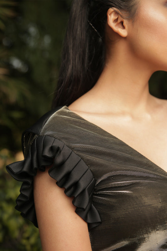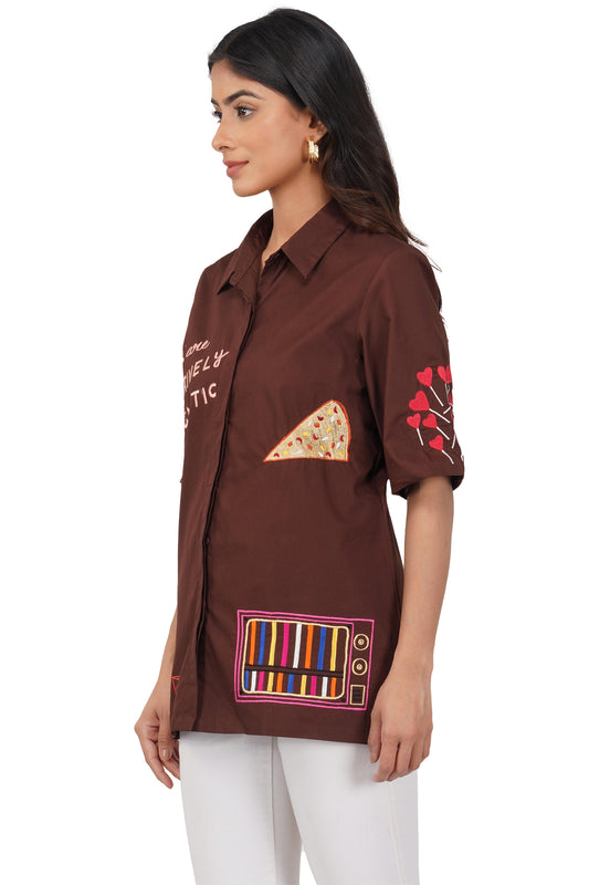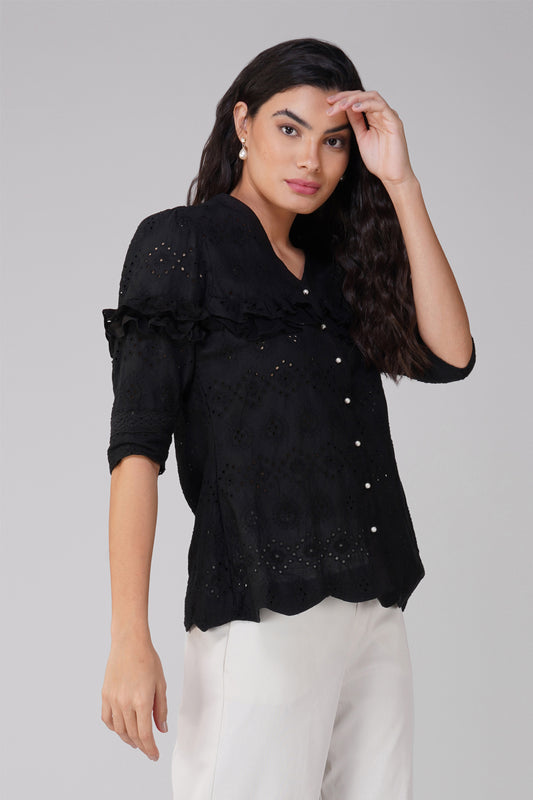 Black Heart Poplin Shirt With 3D Embroidery On The Sleeve With Detailed Frills And Heart Mop Buttons