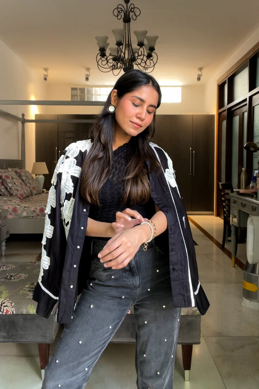 Black Poplin Shirt With Appliqué And Pearl (Mitali Wadhwa)