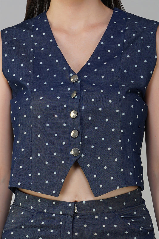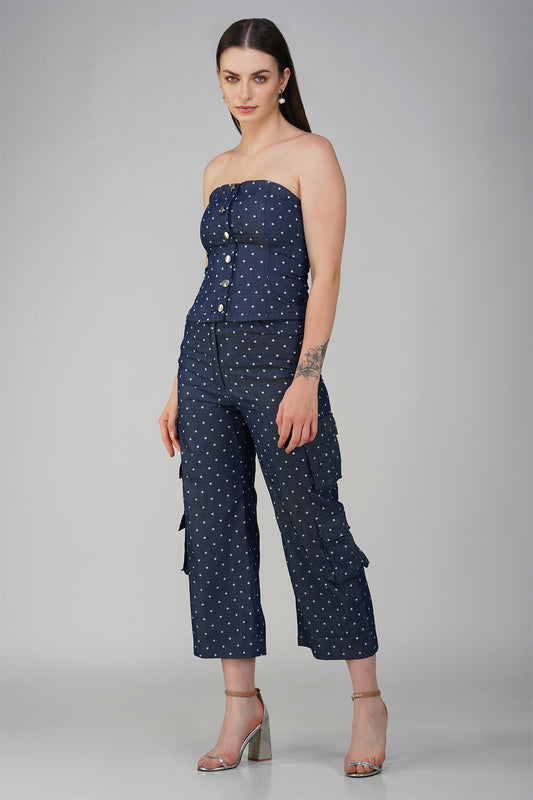 Polka Dot Navy Blue Denim Bustier With Cargo Pants