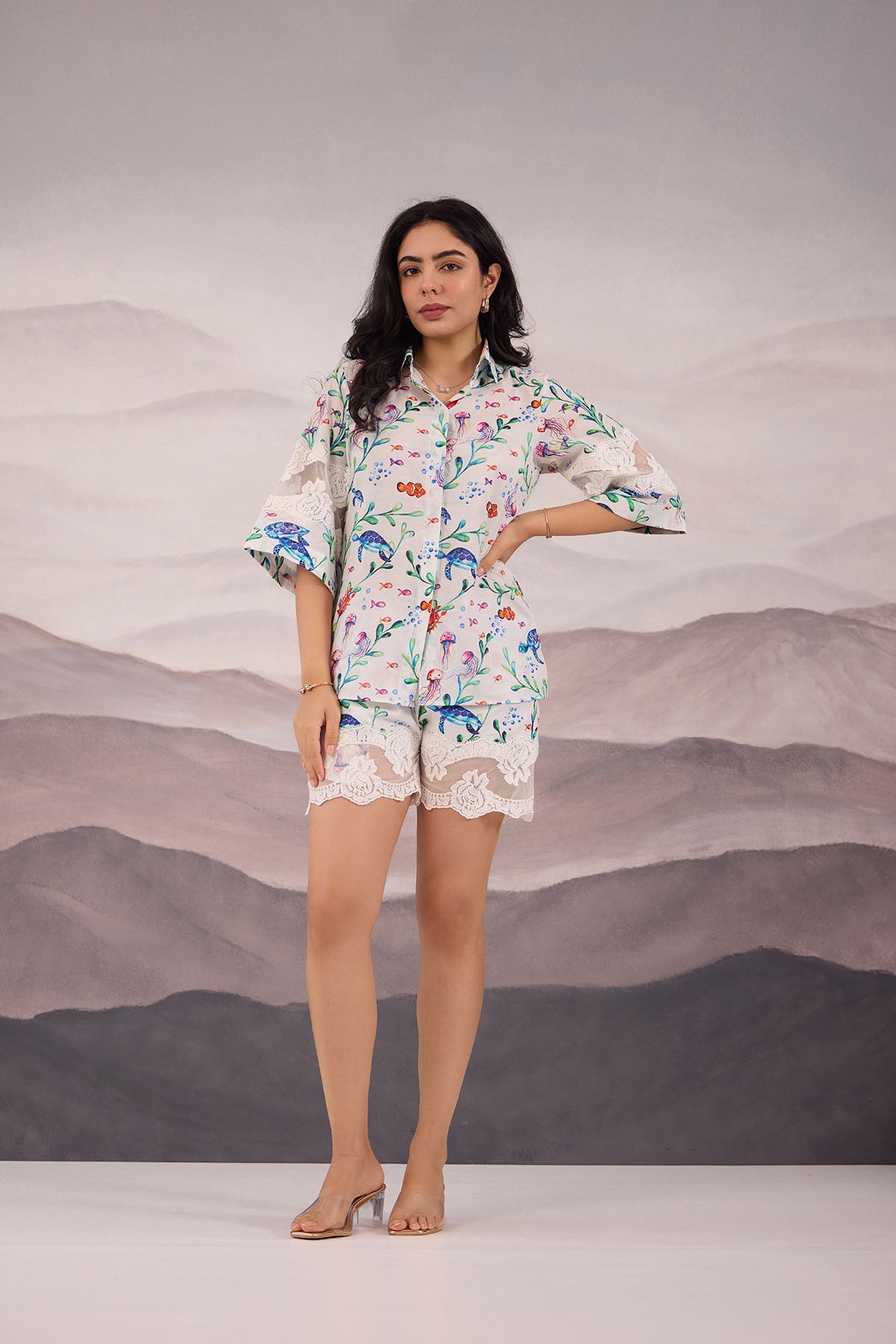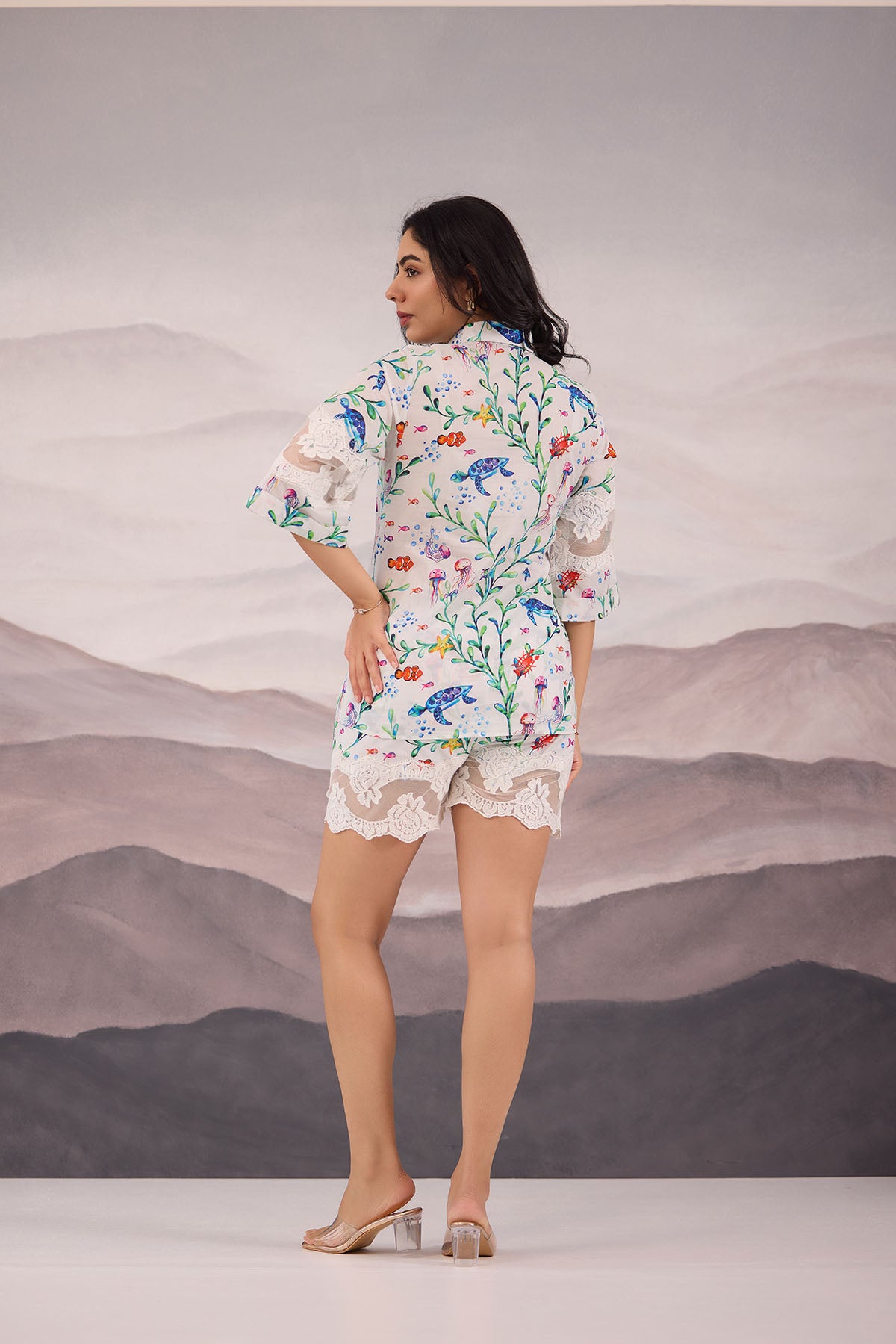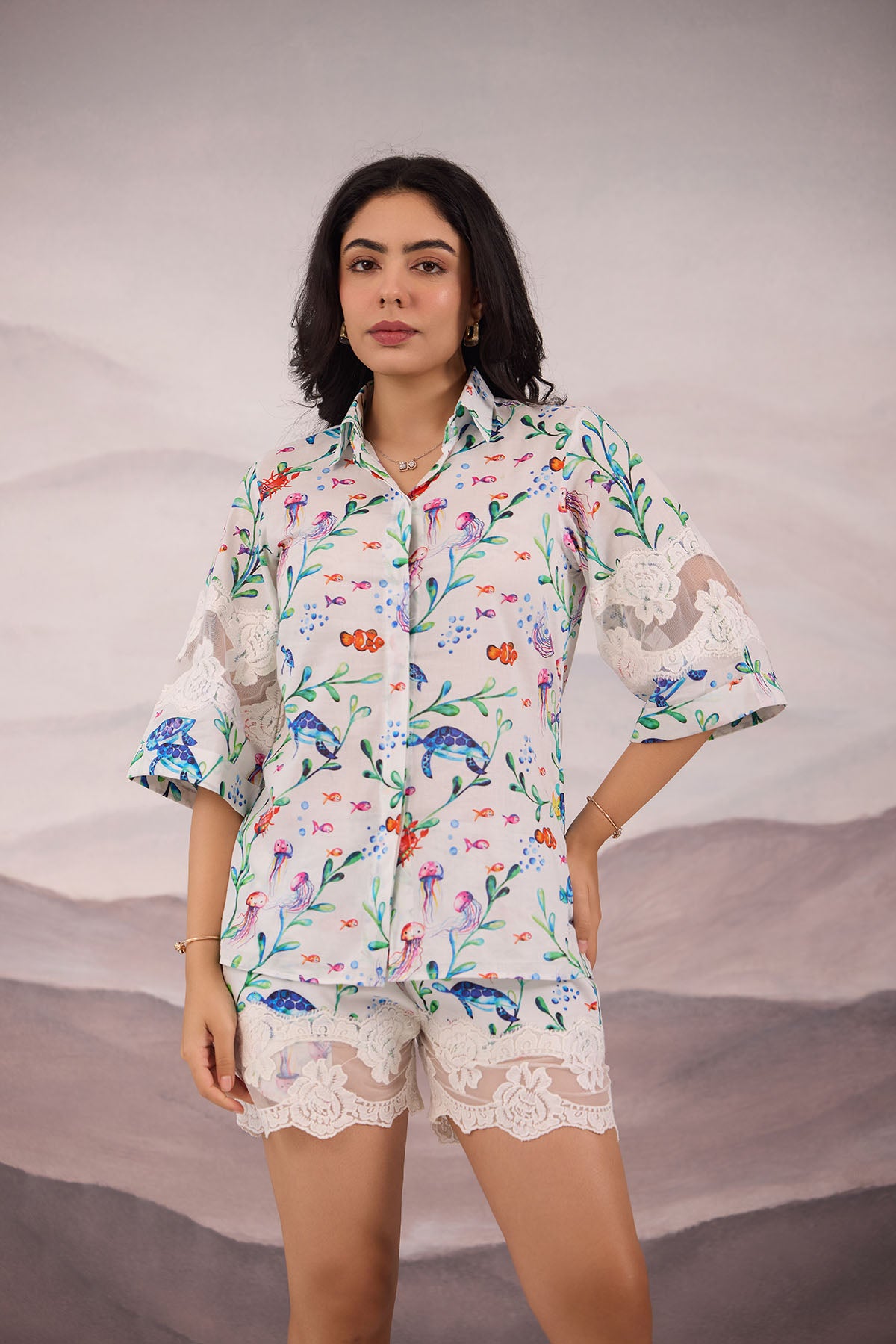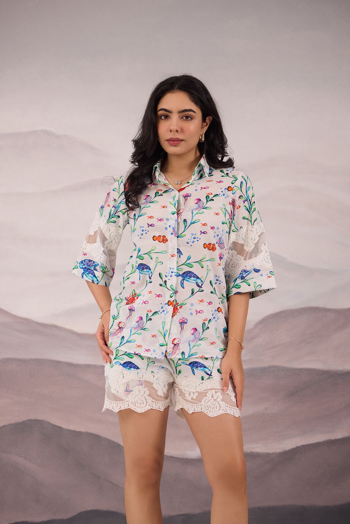 - Cotton coordset perfect for summer vacation with marine print and laced detailing on the shorts