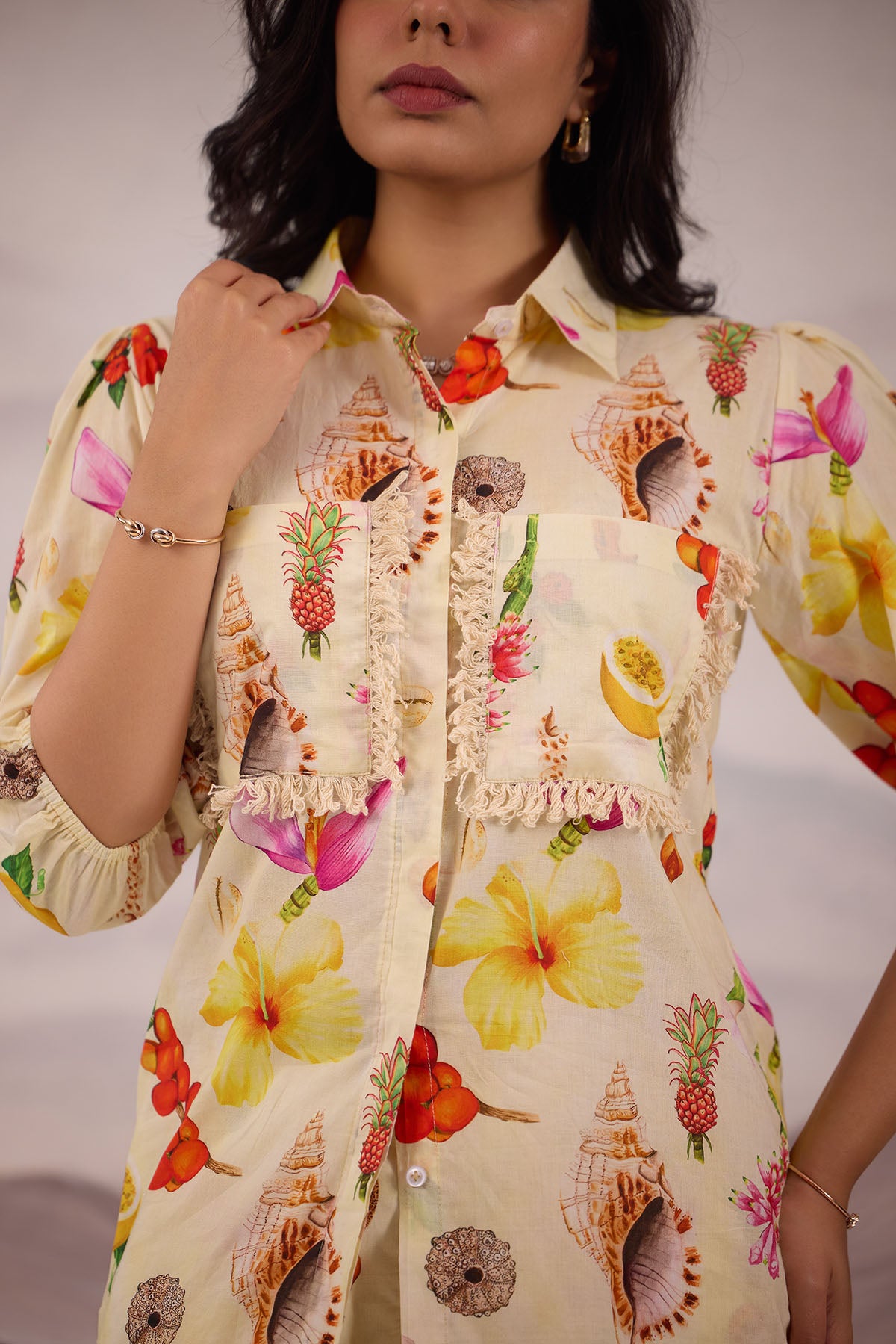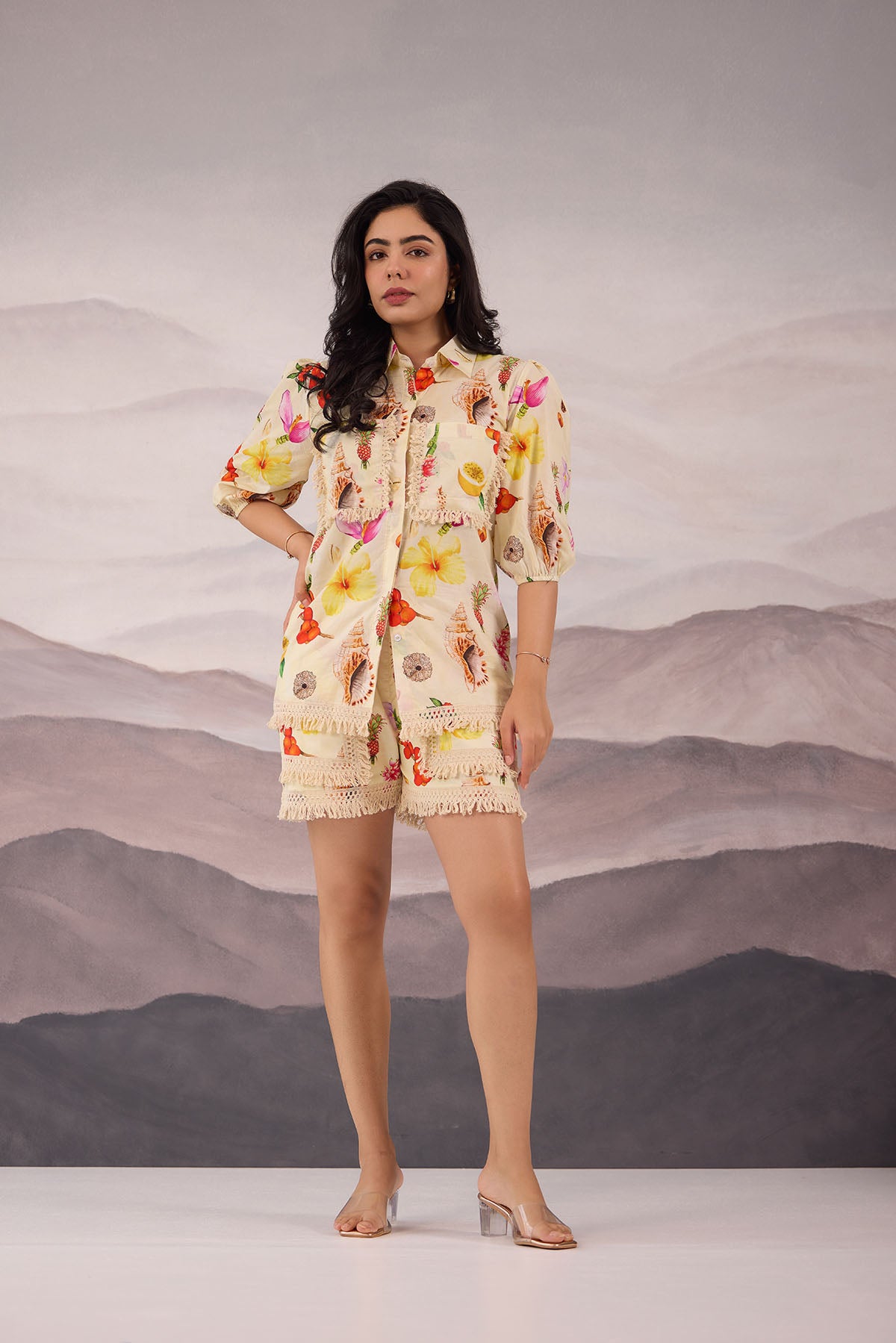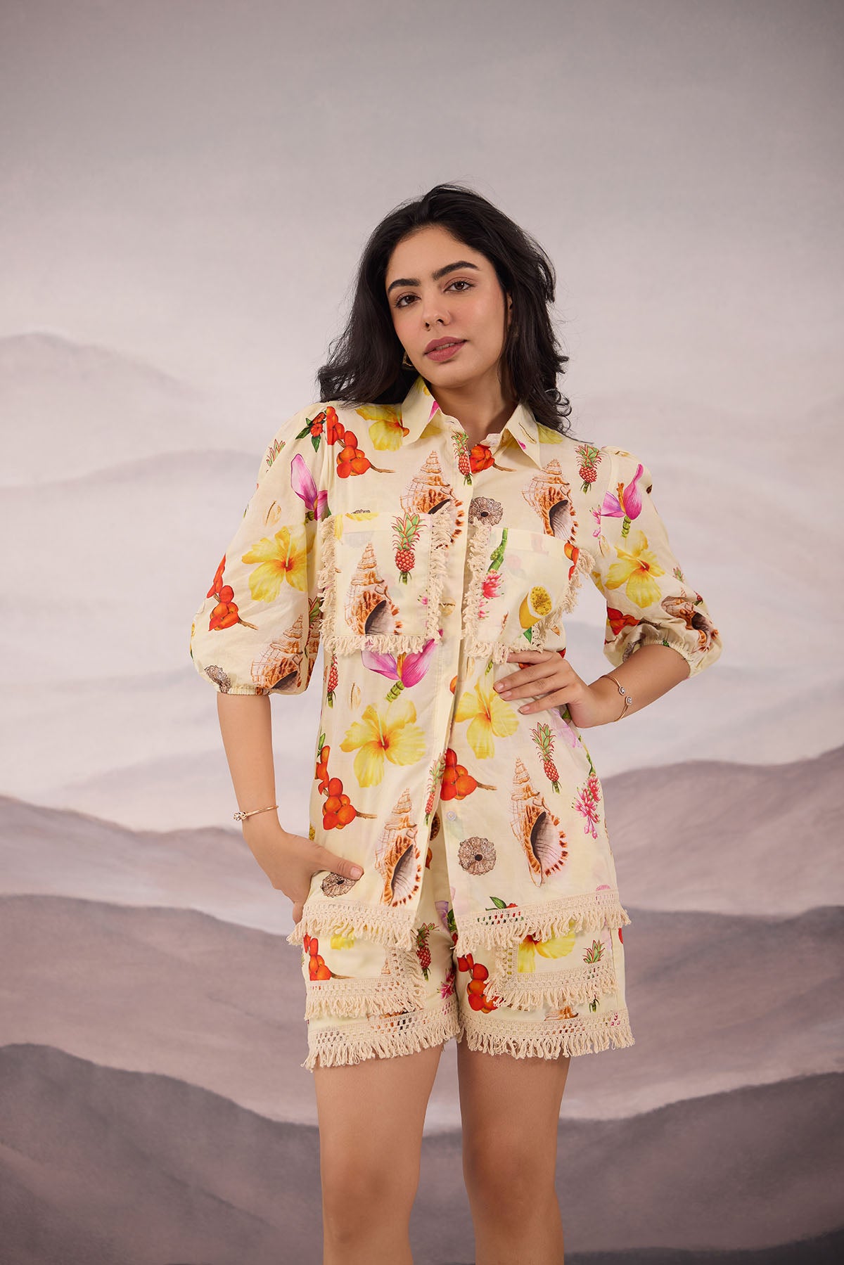 - Cotton satin tropical printed butter color coord with shorts , with fringe detailing on the pockets and on the shorts hem.